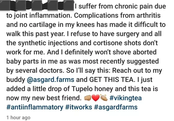Viking Tea is used for a variety of conditions, such as: Stiff & Sore Body, Inflammation & Anti-Inflammatory-related diseases, Cancer, Diabetes, Anemia & Low Iron Levels, Weight Loss, Strengthens Immune System, Low Energy & Fatigue, Arthritis & other Joint Pain, such as Rheumatism, Allergies & Asthma, Constipation, Stomach Pains & Diarrhea, Epilepsy, Stomach & Intestinal Ulcers or Spasms, Chronic Headaches, Heart Problems, Normalize High Blood Pressure, Thyroid Disorders, Low Sex Drive, Enhances Skin & Hair Health.